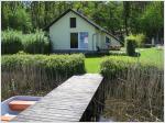 Das Wohnzimmer ist im Landhausstil mit Naturholzmöbeln möbliert. Von dort aus treten Sie direkt auf die Terrasse heraus und das große Panoramafenster öffnet den Blick auf den Wutzsee, der nur einige Meter entfernt ist.