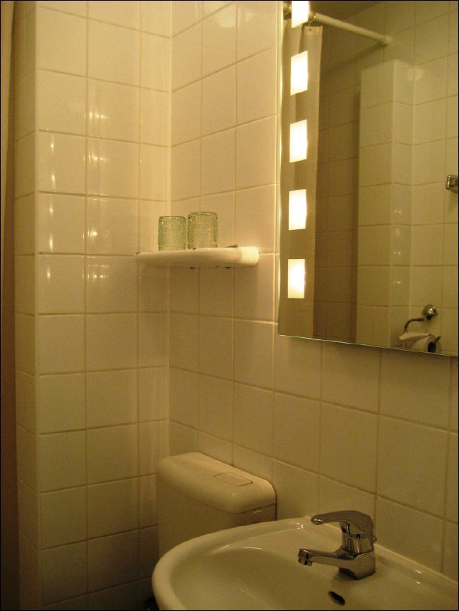 Das Bad ist mit einer Dusche, Handtuchtrocknerheizung und einem großen Lichtspiegel ausgestattet.
