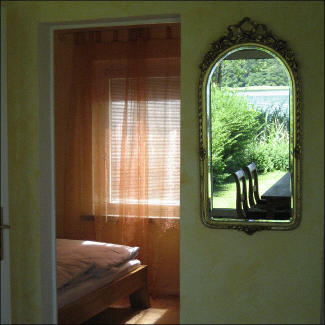 ![]() Blick vom Wohnzimmer ins Schlafzimmer Im Hintergrund des Spiegesl ist der Garten und der Wutzsee zu erkennen. |