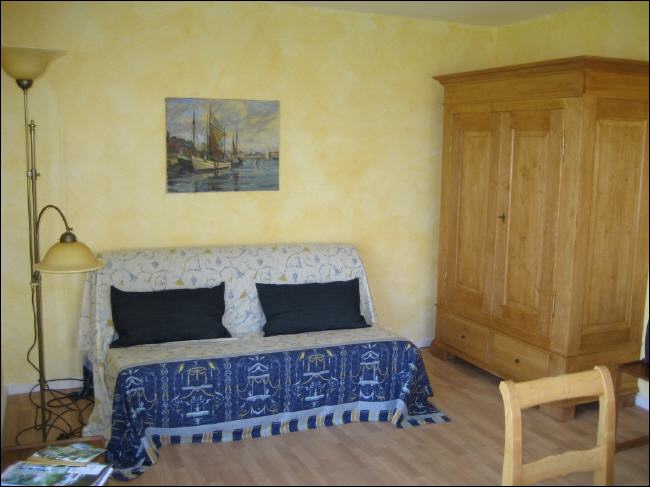 ![]() Couch im Wohnzimeer Die Couch kann im Bedarfsfall ausgezogen werden und als zusätzliche Schlafgelegenheit genutzt werden. |