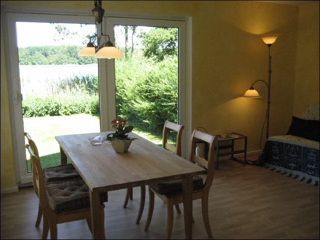 Das Wohnzimmer ist im Landhausstil mit Naturholzmöbeln möbliert. Von dort aus treten Sie direkt auf die Terrasse heraus und das große Panoramafenster öffnet den Blick auf den Wutzsee, der nur einige Meter entfernt ist. |